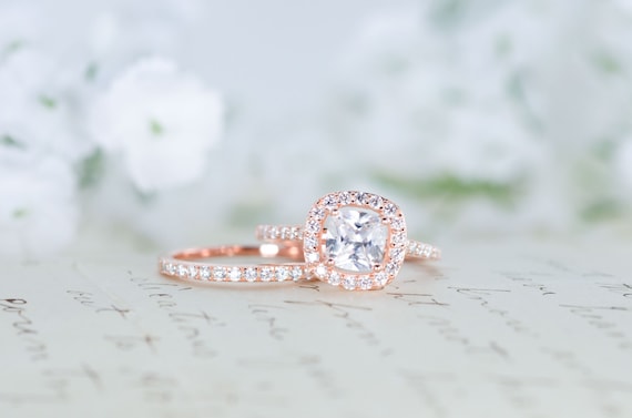 Engagement Ring Gold Ring Moissanite Ring Halo Wedding Ring Etsy Rose Gold Wedding Band With Platinum Engagement Ring