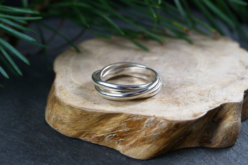 Based upon a traditional russian wedding ring design this ring is made with 3 silver bands with a 18ct yellow gold ring. The most popular color. Tri colors rolling ring made to order with 3 color metal.