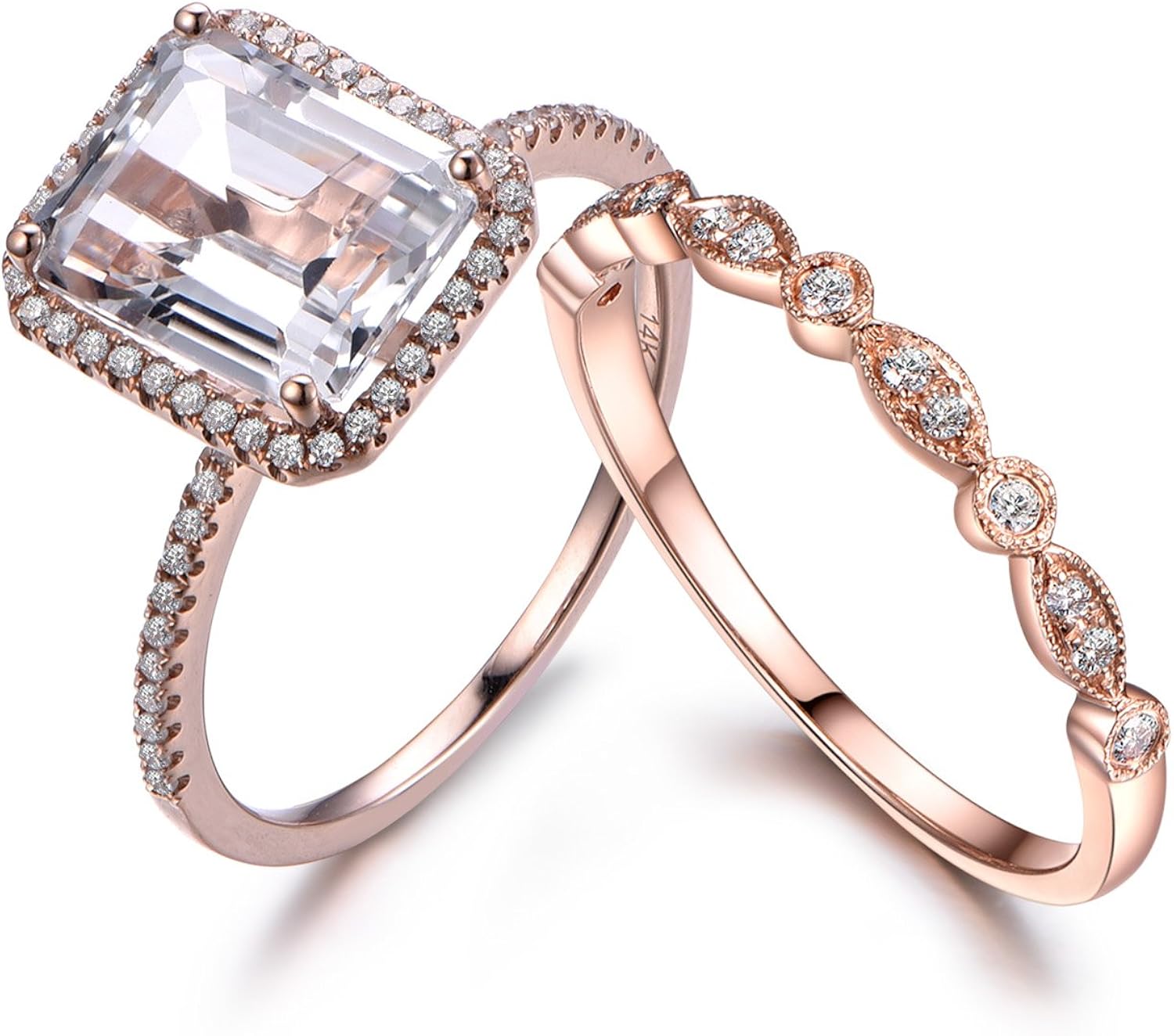 Amazon Com White Topaz Bridal Set 8x10mm Emerald Cut 14k Rose Gold Art Deco Diamond Wedding Band Wedding Ring Set Myraygem Jewelry White Gold Mens Wedding Rings With Diamonds