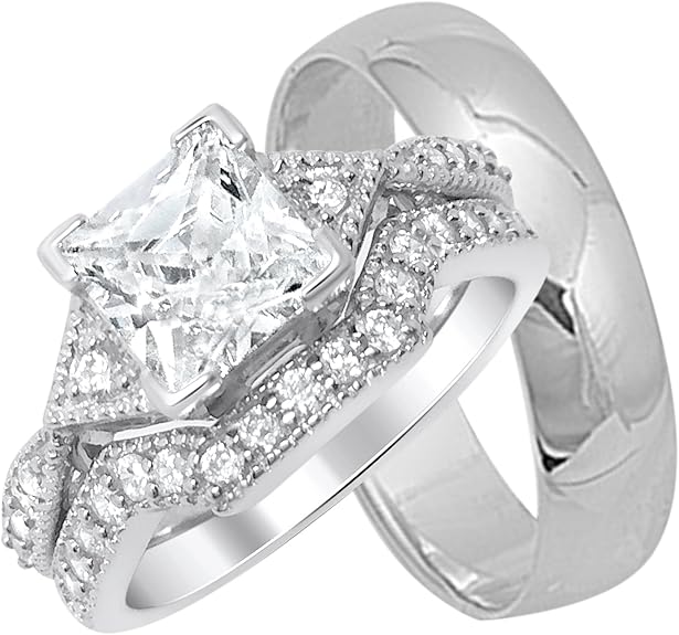 Sterling Silver Cubic Zirconia Engagement Rings Set For Him Her Round Brilliant Cut 3 8 In Wide Silverblings Wedding Ring Designscouple