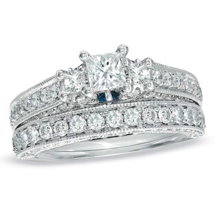 Vera Wang Love Collection 2 Ct T W Princess Cut Diamond Three Stone Vintage Style Bridal Set In 14k White Gold Engagement Rings Wedding Zales Outlet Matching Walmart Wedding Rings Sets For Him And Her